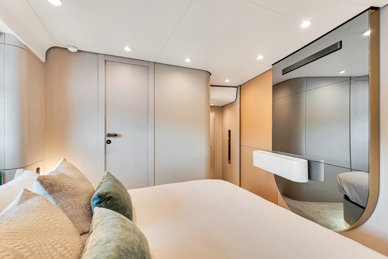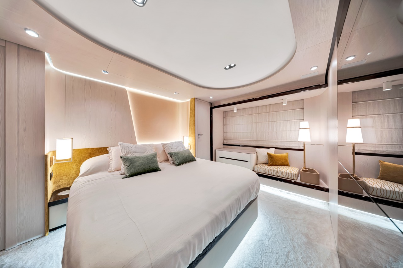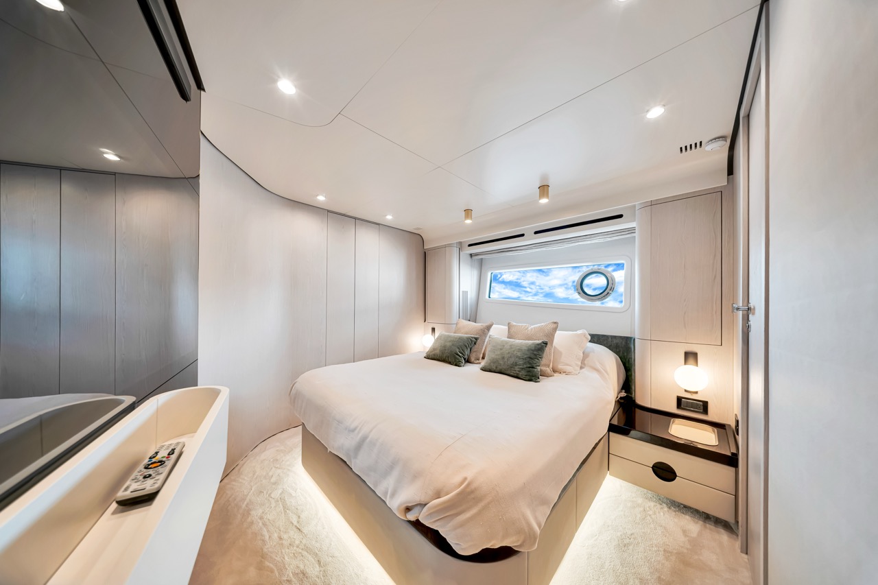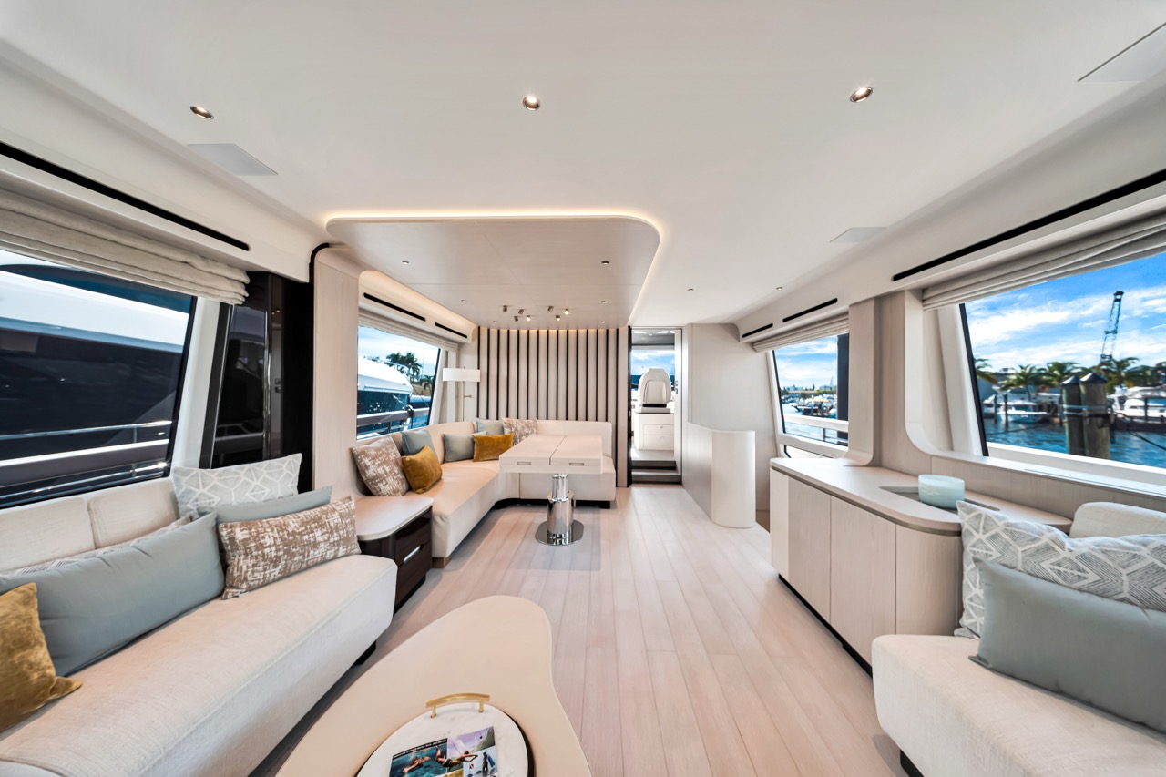 Aerial three-quarter view Flybridge lounge & helm Bow sunpads with skyline backdrop Aft cockpit dining area Salon with panoramic windows Dining area β€” interior perspective Galley β€” appliances & storage Primary stateroom β€” queen berth VIP stateroom β€” queen berth Guest cabin β€” layout detail Evening profile β€” warm lighting Cockpit overview β€” alternate angle Bridge helm electronics close-up Foredeck view toward skyline Helm electronics and controls Cabin corridor and storage Salon lounge β€” alternate angle Upper deck seating detail Aft deck dining setup Sunset cruise by the bay Wide view β€” flybridge lounge Side profile at dock β€” dusk ambience Night lighting β€” exterior ambience Salon media console and storage Companionway to cabins β€” interior detail Aft deck seating configuration Bridge seating β€” alternate angle Bow at anchor β€” downtown backdrop Aft cockpit β€” evening setup Detail lighting β€” interior trim Material textures β€” close-up Overhead lighting β€” lounge Daybed detail β€” upper deck Sunshade & seating β€” flybridge Transom access and cockpit Foredeck seating β€” cushions Side walkway β€” handrails Bridge seating cluster Upper deck dining setup Detail β€” upholstery & stitching Evening deck lighting