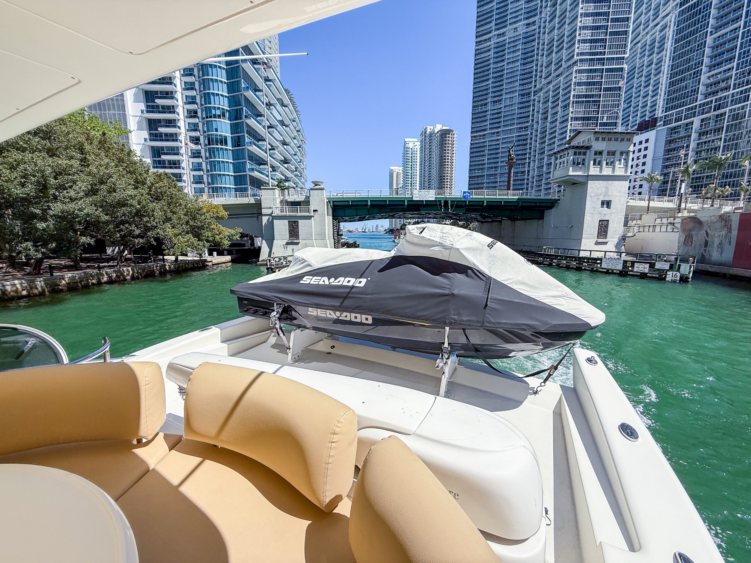 Azimut 70 Container gliding across Biscayne Bay with the Miami skyline
