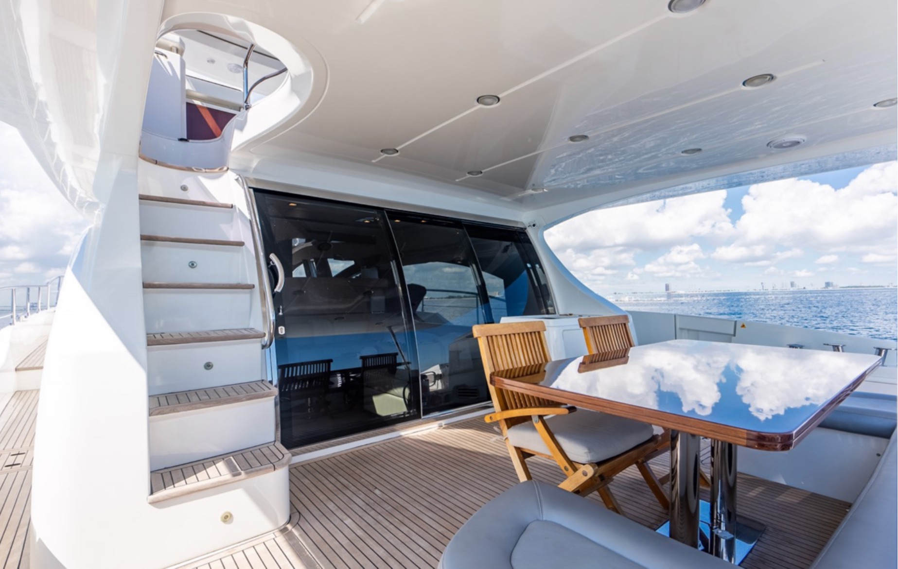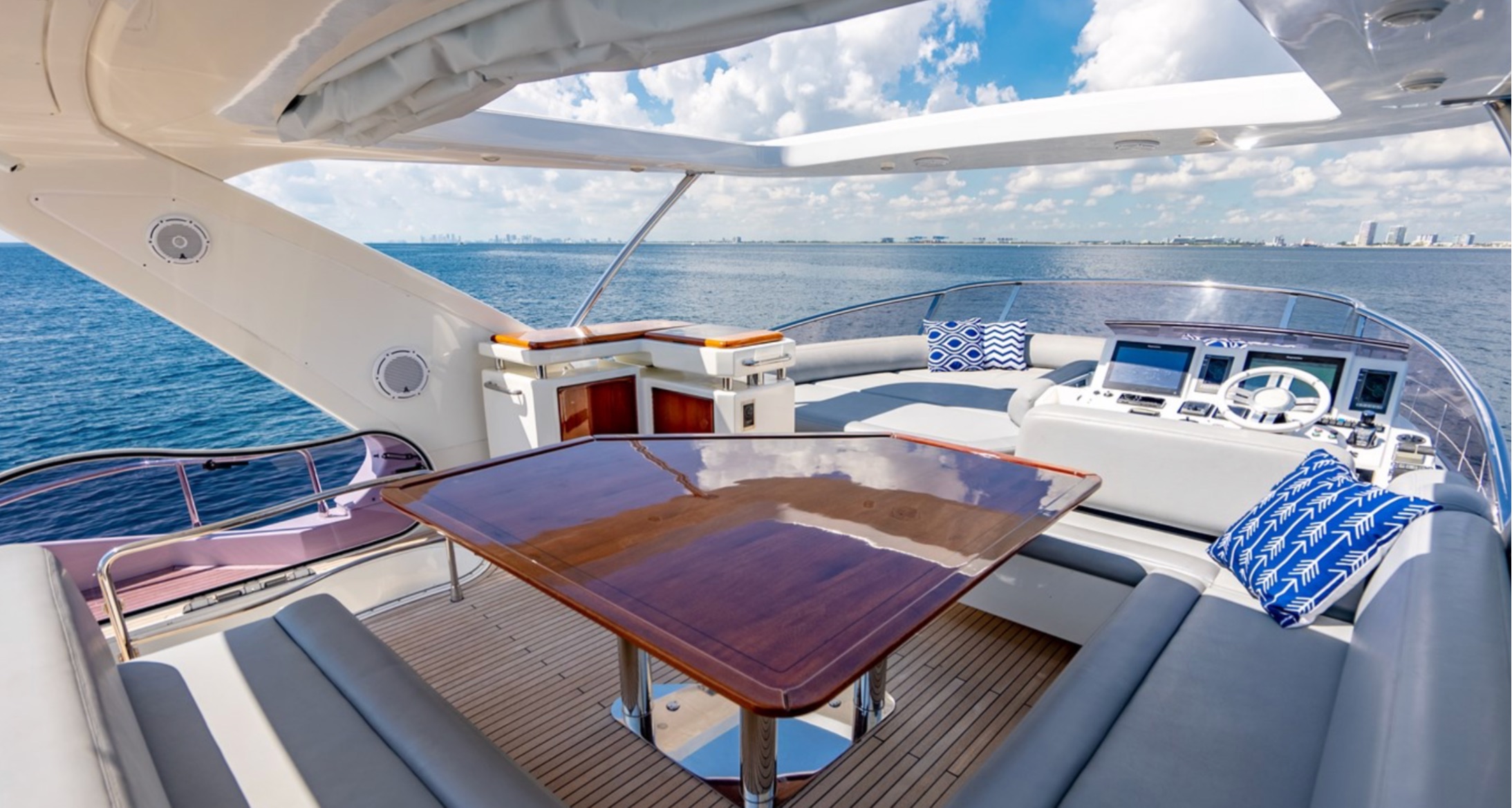πŸ›₯️ Luxury 70-ft flybridge yacht with expansive lounges β€” perfect for birthdays, sandbar days & skyline sunsets across Biscayne Bay.